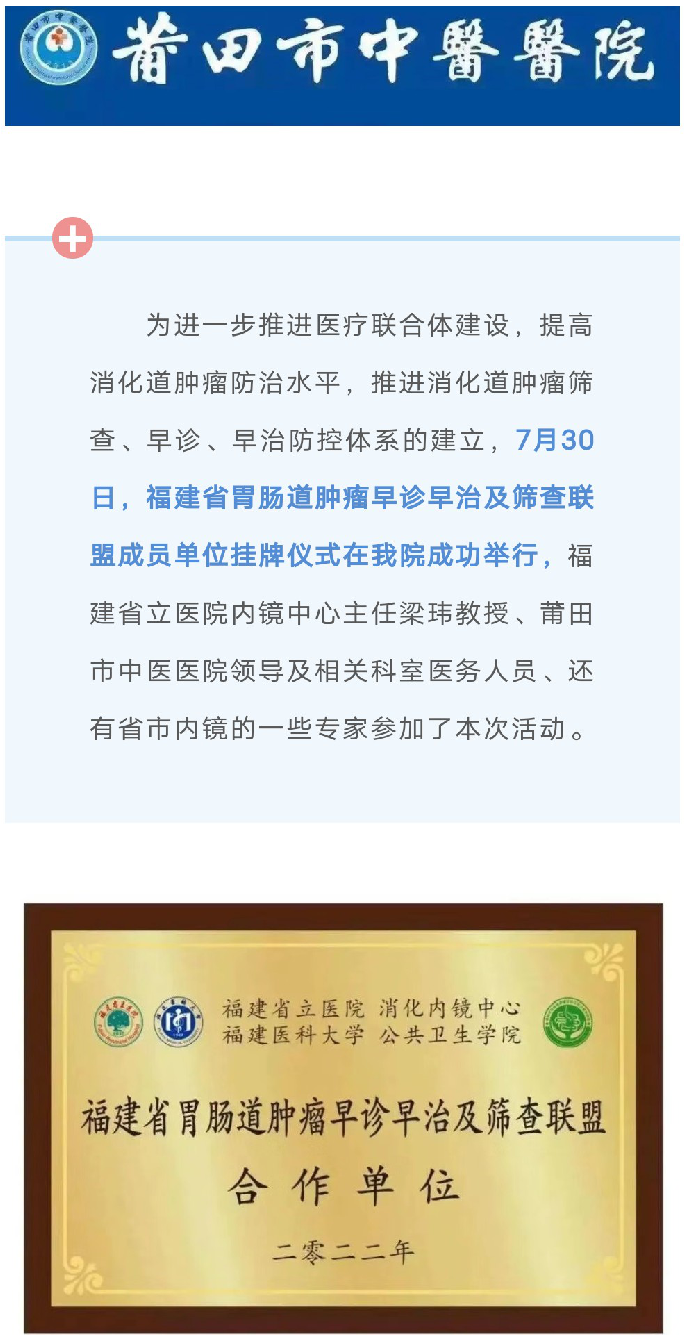 喜讯!热烈庆祝我院成为福建省胃肠道肿瘤早诊早治及筛查联盟成员单位