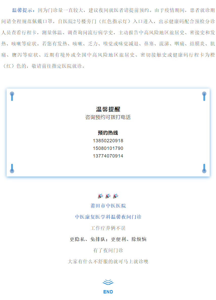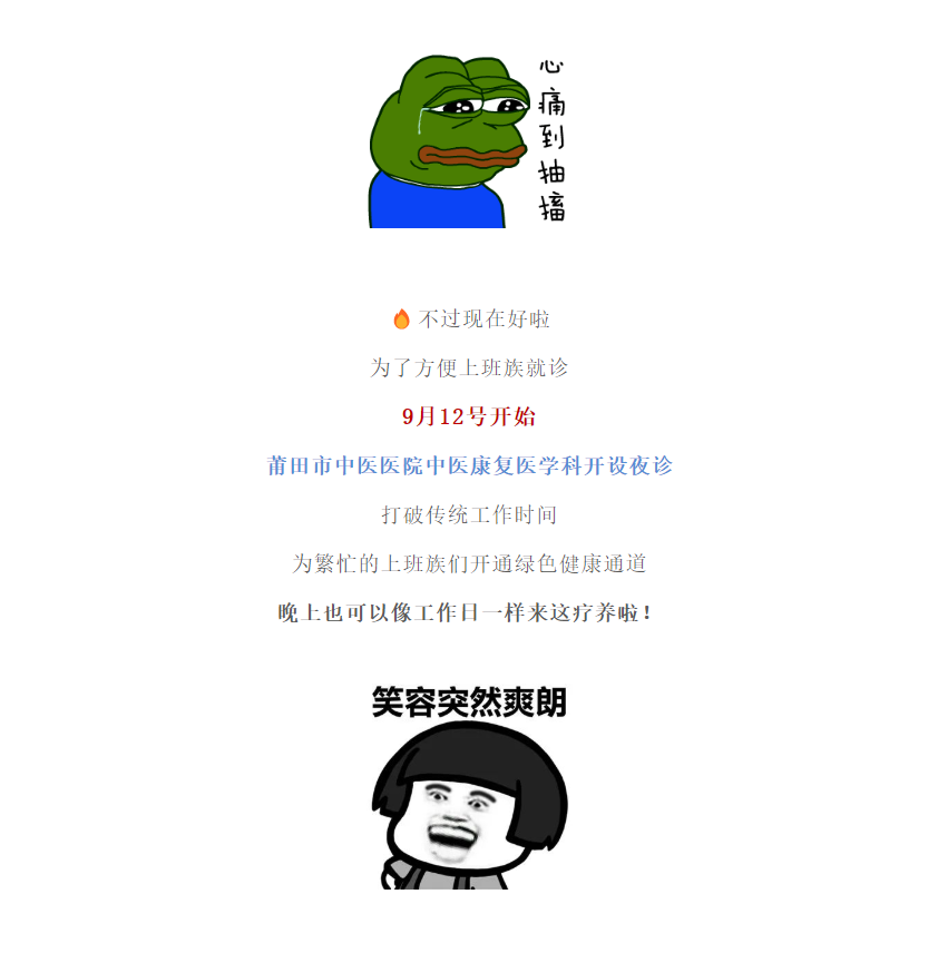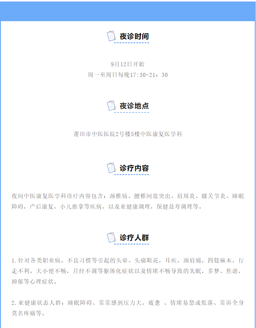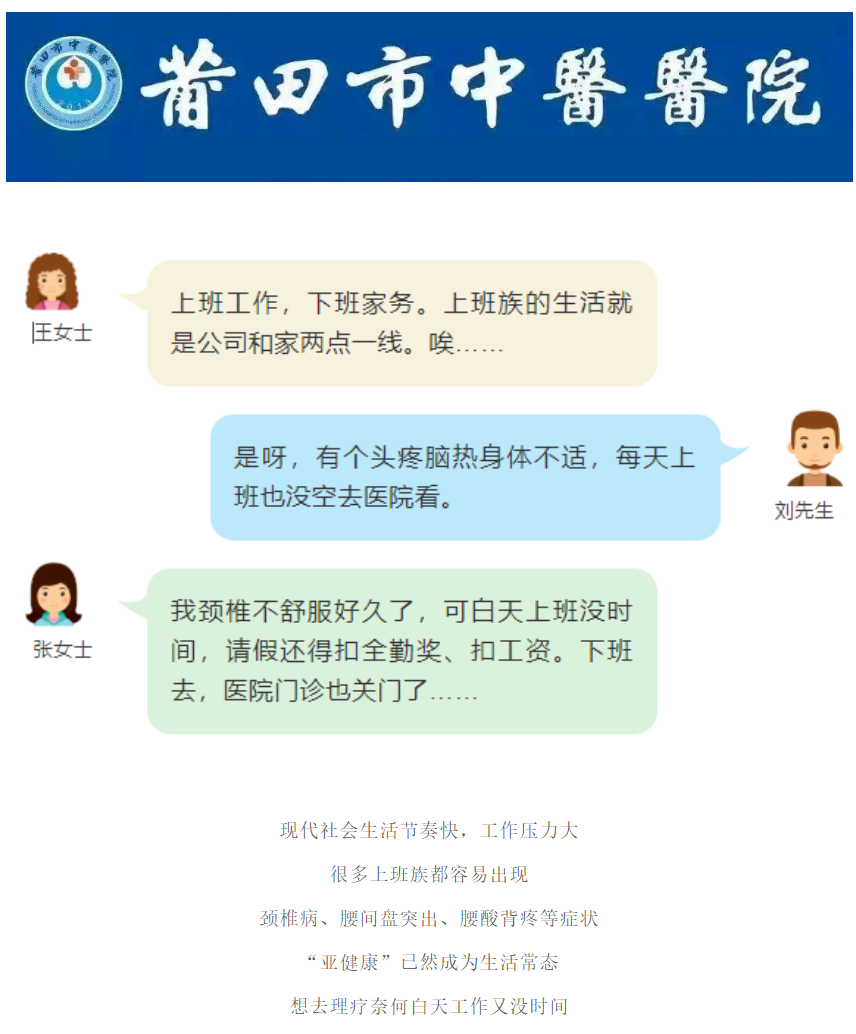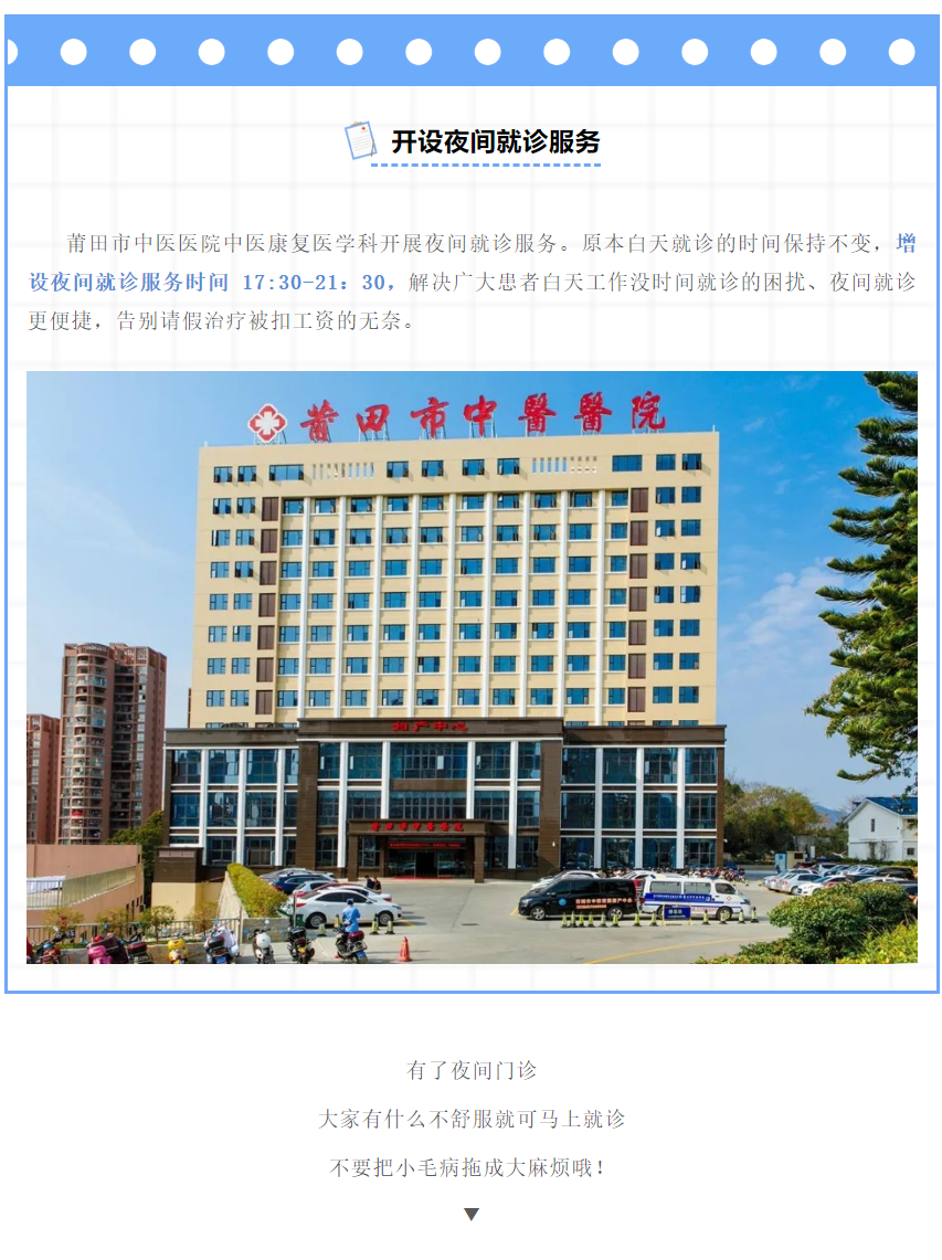 好消息!莆田市中医医院中医康复医学科开设夜诊,工作疗养俩不误,下班也能看专家!